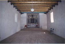 Picuris Pueblo Nears Completion of San Lorenzo MissionPhotos by Kay MatthewsOn June 19 thirty-one volunteer workers were on hand to help apply the first coat of traditional mud plaster on San Lorenzo Mission at Picuris Pueblo. For eight years the pueblo has been working to restore the centuries-old church, and as San Lorenzo Feast Day (August 10) approaches, completion is in sight . On hand for the plastering were youth groups from Peñasco, tribal council members and village elders, under the direction of First Fiscale Clarence Chili (Second Fiscale is Luther Martinez). The original site of the mission church was across the road from the present location. The church at the present site was completed in 1751. After the building began to deteriorate, the Picuris Pueblo Restoration League was established in the 1980s, with Richard Mermejo as Chair, Gerald Naylor as Vice Chair, Tom Martinez as Secretary, and Carl Tsosie as Builder. During the last three years the church has been functional: the Matachines dance here at Christmas time, mass is celebrated once a month by Father Ortiz, and last year Archbishop Sheehan conducted mass on the feast day. Volunteers are always welcome to help with the restoration work. |