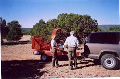 Fish and Wildlife personnel demonstrate new chipper The alliance is also considering ways to take advantage of the organic foods market. They discussed the potential need for a second organic meat processing plant (there's only one small, certified facility in El Rito which must service the entire state) and the possibility of establishing a new facility in the Pecos watershed. Community members were also encouraged to attend the upcoming New Mexico Organic Farming and Gardening Expo which will take place in nearby Glorieta on February 10 to get more information about all aspects of organic farm and ranch production Grassbanks, which are private holdings or public lands that have been set aside to provide graze while restoration work occurs on ranches and grazing allotments were also a topic of conversation. Diane, who attended the recent grassbank conference in Santa Fe, said the group has identified an approximately 33,000 acre parcel of Forest Service land formerly included in the San Miguel del Vado Land Grant that the group would like to encourage the Santa Fe National Forest to consider using as a grassbank for community ranchers. Alliance members, who have expressed concern about getting reliable information about land restoration, then heard a presentation by Santa Fe National Forest hydrologist Steven McWilliams about Properly Functioning Conditions (PFC) with regard to restoration of riparian areas. McWilliams said that PFC is part of a national effort which brings the Forest Service, the Bureau of Land Management, the Environmental Protection Agency, and the Natural Resources Conservation Service together with other state and local agencies to evaluate land conditions in a non-judgmental way. Utilizing a checklist involving 17 separate but interrelated categories, PFC teams are able to determine if riparian areas are "functioning properly, functioning but at risk, or not functioning properly." If areas are at risk or non functioning, PFC teams can help determine problems and refer land owners or public lands managers to agencies and individuals who can suggest ways of restoring the areas. McWilliams told the group that there is also a drylands version of PFC. The group has secured the senior center in San Miguel for future meetings. People interested in more information about the alliance can contact Marcia Diane at 421-2998.