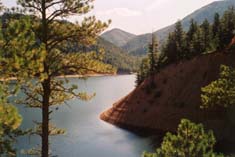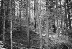 Steep canyon slopes above McClure Reservoir La Jicarita News recently accompanied Max Córdova, of La Montaña, and Dave Henderson, of the Audubon Society, on a tour of the restoration site. The watershed is at the top of Canyon Road, where Santa Fe's two supply reservoirs, Nichols and McClure, collect water from the surrounding steep mountain slopes. The restoration site owned by the city consists of lands immediately adjacent to the reservoirs, surrounded by national forest. The watershed has been closed to public access, resource extraction, and all natural and man-made fires have been suppressed since 1932. As a result, the area is badly overgrown with densely stocked, thin-diameter trees and doghair thickets. Córdova estimates that in the area where they are working there are 550 to 750 trees per acre, which they hope to reduce to around 220 trees per acre. He pointed out that the build-up of understory forest fuels (ladder fuels) could lead to a crown fire like the one that devastated Los Alamos. The area, which is approximately 8,000 feet in elevation, is covered with stands of ponderosa pine and mixed conifer. The La Montaña crew of six people has been thinning the area with chainsaws and snaking the trees down to the road with four-wheel all terrain vehicles. The contract stipulates that no trees larger than eight inches in diameter be cut, but allows the consulting professional forester to determine the prescription. Córdova pointed out that the cutting prescription has to be flexible in order to address site specific needs: "One formulaic prescription can't fit all."