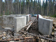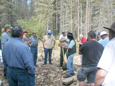 Picuris Pueblo Governor Gerald Nailor talking to commissioners and mayordomos at Alamitos What we saw at the oldest diversion on the Alamitos, which delivers water to the Cañoncito y Encinal Acequias, was disturbing. The diversion was originally constructed out of logs, but the acequia commissions received capital outlay money from the state legislature to build a concrete headgate in 2007. Somehow the Texas branch of Trout Unlimited got involved in the project and added a fish barrier for native trout to the diversion. In July of 2010, however, flood waters blocked the headgate with debris and washed away the embankment. The commissioners subsequently received $22,000 in FEMA funding (they also received$143,000 in stimulus funding in 2010 for other acequia rehabilitation) to return the acequia to its original condition. John Miera, at the Carson National Forest Supervisor's Office, is now demanding that the acequias must get special use permits to rebuild the project, just as he did on projects on the west side of the mountain (see La Jicarita News, April 2009).