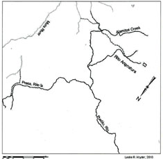 Map showing the three acequia diversions in relationship to the Rio Pueblo and Rio Mora. The Acequia del Rito Griego y la Lierra is diverted from the Rito la Presa, the northern most diversion in La Junta Canyon. The Acequia de la Sierra de Holman is diverted from the Rito Angostura. The Cañoncito y Encinal Acequias are diverted from Alamitos Creek. Whether the Pueblo actually gave its permission for these diversions is open to question. In fact, in 1882 the Pueblo filed suit to stop the diversion of water to Holman and also claimed that the Pueblo had protested the other two diversions as well. For unknown reasons the Pueblo did not pursue the lawsuit, and the parciantes from the Mora Valley, represented by the infamous Thomas Catron, who had obtained an interest in the Mora Land Grant, successfully had the suit dismissed. But it was dismissed without prejudice, which means the Pueblo was free to pursue its complaint in the future. The mood of the field trip more than a hundred years later was conciliatory, however. Governor Nailor told the assembled group that the Pueblo wants "an equal playing field" and that there need to be gauges installed at the diversions that measure the amount of water agreed to by all the involved parties.