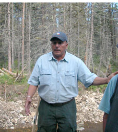 Jimmy Sanchez, mayordomo of the Acequia de la Sierra de Holman The Acequia del Rito Griego y la Sierra in La Junta Canyon feeds into two acequias in Chacon, Acequia La Joya and Rito Griego. If you drive into Chacon from the Mora Valley you can see its drop-off from the mountain top to the acequias. The headgate for the new diversion was built in September of 2008. This is the ditch that seems to run uphill and defy gravity. It is testimony to the ingenuity and perseverance of its builders, but on the day wevisited, during this year of drought, the water being diverted was not able to travel the three and a half miles to the drop-off. One of the BIA officials on the tour suggested the obvious: that when thereÄôs not enough water to make it to the acequias the diversion should be closed and the water allowed to travel down La Junta to the Rio Pueblo. When I asked how the acequia commissioners on the two Chacon ditches divide the water into shares, they responded that the headgate diverts half to the Chacon acequias and the other half flows down La Junta Canyon to the Rio Pueblo. Again, Governor Nailor pointed out that there needs to be a gauge and an agreed upon formula for sharing the water.
