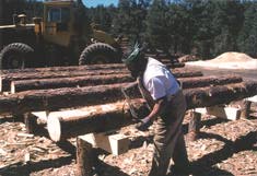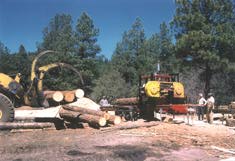 Vallecitos Sawmill at WorkPhotos by Claire CummingsFive employees of La Companía Ocho have been working at this sawmill site near the village of Vallecitos, milling sawtimber and peeling vigas. The timber, so far, is from the Jacques Tank sale. Ike DeVargas, La Companía founding member, hopes that with a $10,000 grant from the Forest Service and the return of a $5,000 performance bond the company will be able to buy a saw sharpener for the Heartwood Saw (pictured at right and below) that has been working overtime. Meanwhile, La Companía is preparing a work plan required for a funding proposal they will submit to the Northcentral Economic Development District. Several more sales are up and coming, and a skidder is removing trees along the La Manga sale right-of-way. Timber felled last year is decked (in good shape, with little blue stain) within the units already partially cut. The company would also like to purchase a planer and kiln drier to produce construction-grade lumber. The market for the rough-sawn wood they are producing at the site is soft: too many regulations prevent it from being marketed for mainstream construction. They have been selling to a door company in Santa Fe and to various other markets throughout the region. At this point, La Companía has more volume of timber than just about any other logging company in New Mexico.