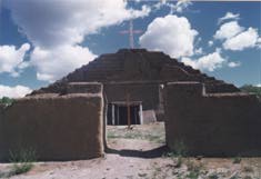 Picuris Pueblo Nears Completion of San Lorenzo MissionPhotos by Kay MatthewsOn June 19 thirty-one volunteer workers were on hand to help apply the first coat of traditional mud plaster on San Lorenzo Mission at Picuris Pueblo. For eight years the pueblo has been working to restore the centuries-old church, and as San Lorenzo Feast Day (August 10) approaches, completion is in sight . On hand for the plastering were youth groups from Peñasco, tribal council members and village elders, under the direction of First Fiscale Clarence Chili (Second Fiscale is Luther Martinez). The original site of the mission church was across the road from the present location. The church at the present site was completed in 1751. After the building began to deteriorate, the Picuris Pueblo Restoration League was established in the 1980s, with Richard Mermejo as Chair, Gerald Naylor as Vice Chair, Tom Martinez as Secretary, and Carl Tsosie as Builder. During the last three years the church has been functional: the Matachines dance here at Christmas time, mass is celebrated once a month by Father Ortiz, and last year Archbishop Sheehan conducted mass on the feast day. Volunteers are always welcome to help with the restoration work. |